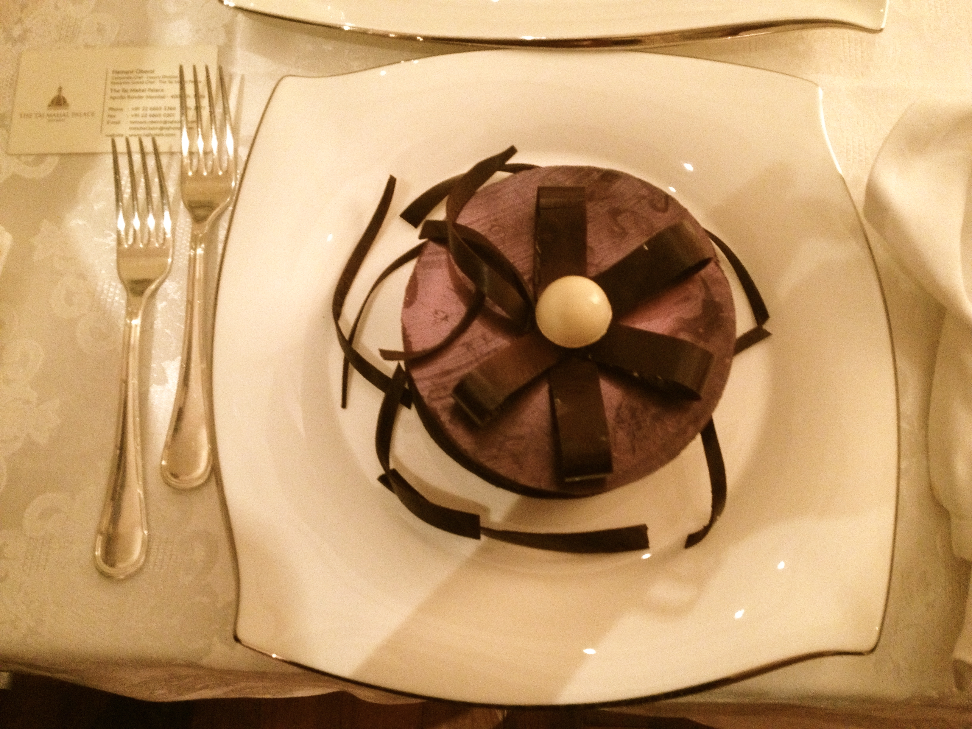 Surprise! Surprise! Chef Hemanth Oberoi, Β the Grand Executive Chef at The Taj Mahal Palace in Mumbai, as well as corporate chef for the entire Taj chain of hotels; and most importantly the man who designed the menu for my wedding -had sent to our room ; not one, not two- BUT THREE GIGANTIC CHOCOLATE CAKES! Now we had THREE PLUS ONE FROM EARLIER!!!! π