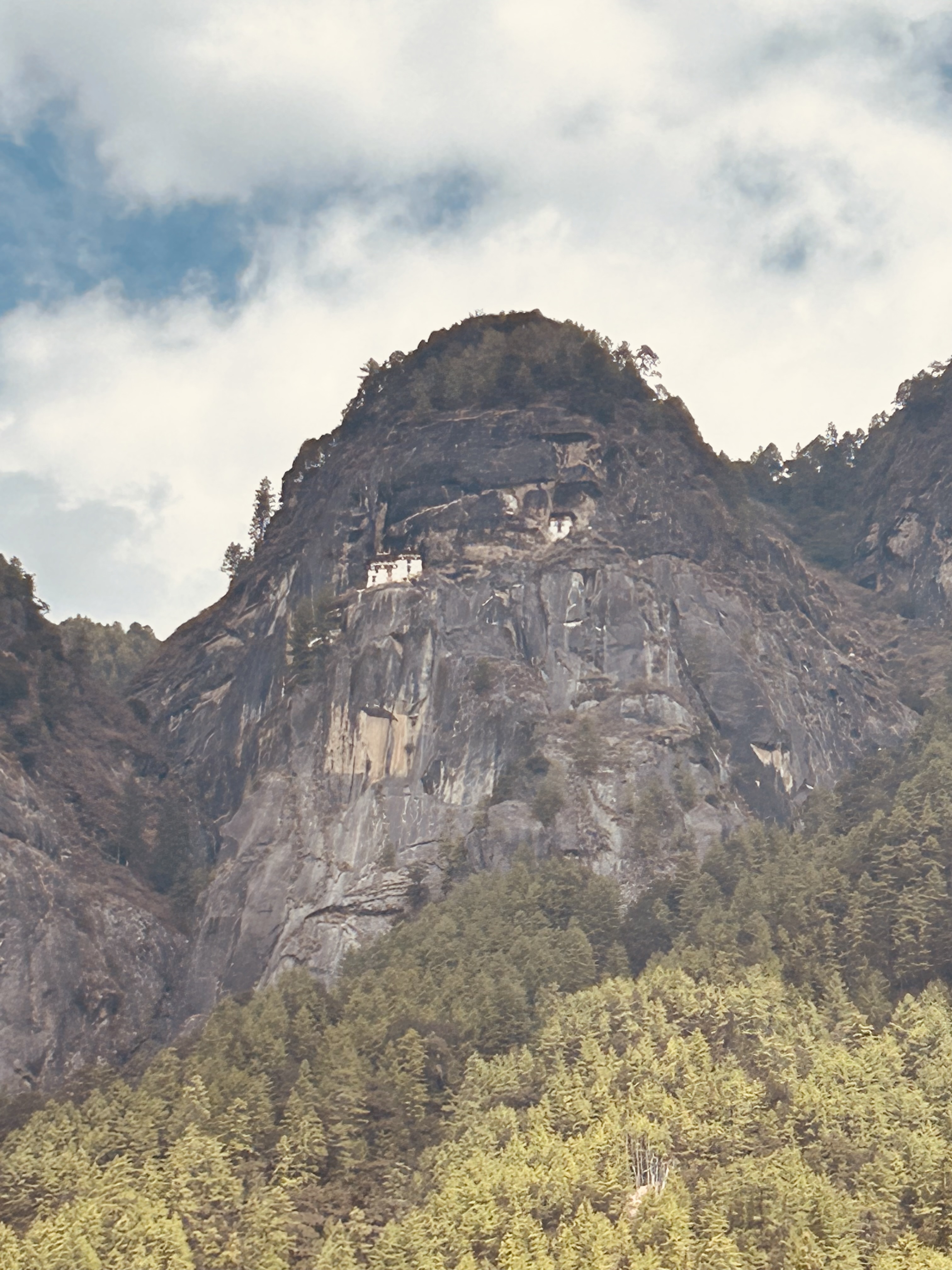 The next morning we left post breakfast to Tiger’s Nest. Now if you plan to trek up to Tiger’s Nest , Paro Taktsang, also known as the Taktsang Palphug Monastery and the Tiger’s Nest is a sacred Vajrayana Himalayan Buddhist site located in the cliffside of the upper Paro valley it is advised to leave early if you wish to climb to the top. It is said that this climb can take 4 hours or more. At the half way mark there is a cafe and rest stops. A donkey can carry you up to the half way mark but post that you have to climb yourself.There are about 700 steps down and then 250 steps up at the end. But the steps are a very small part of the journey which consists of a trekking route. Returning, of course, there are about 250 steps down and then 700 steps up. The hike is approximately 6 km.